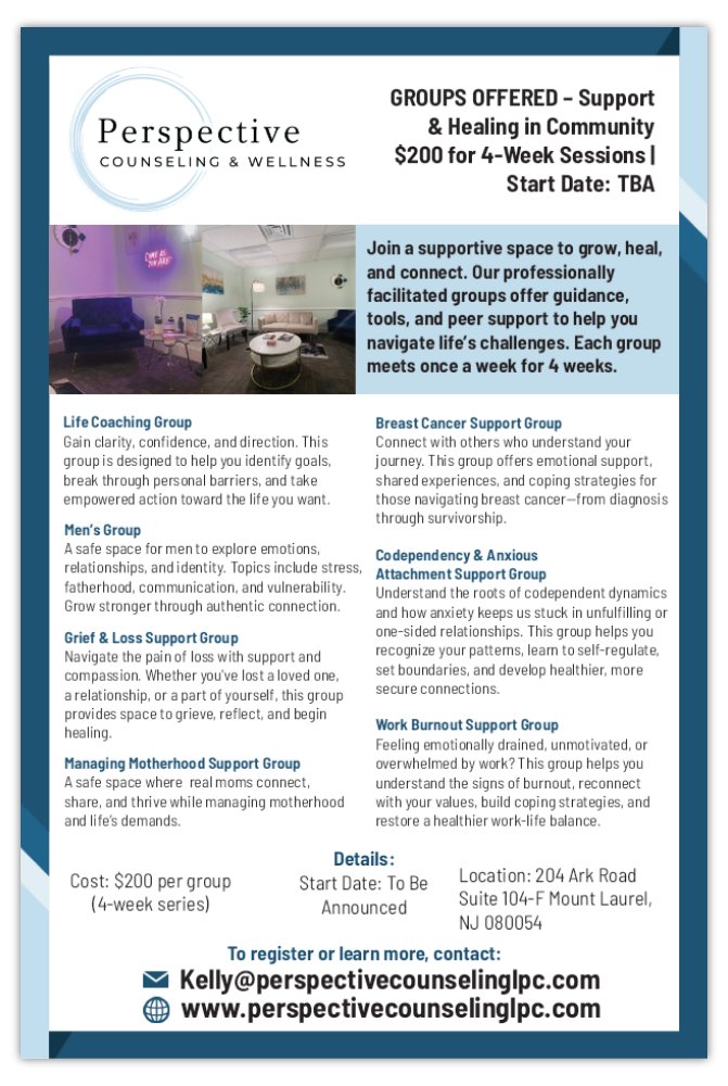 Beyond therapy, we strive to create platforms for education and perspective. I host the Let’s Talk Perspective podcast and contribute articles to Moorestown Living Magazine, sharing insights on mental health, personal growth, and wellness. We also provide clinical supervision for developing counselors, helping the next generation of professionals build skills, ethical competence, and confidence.