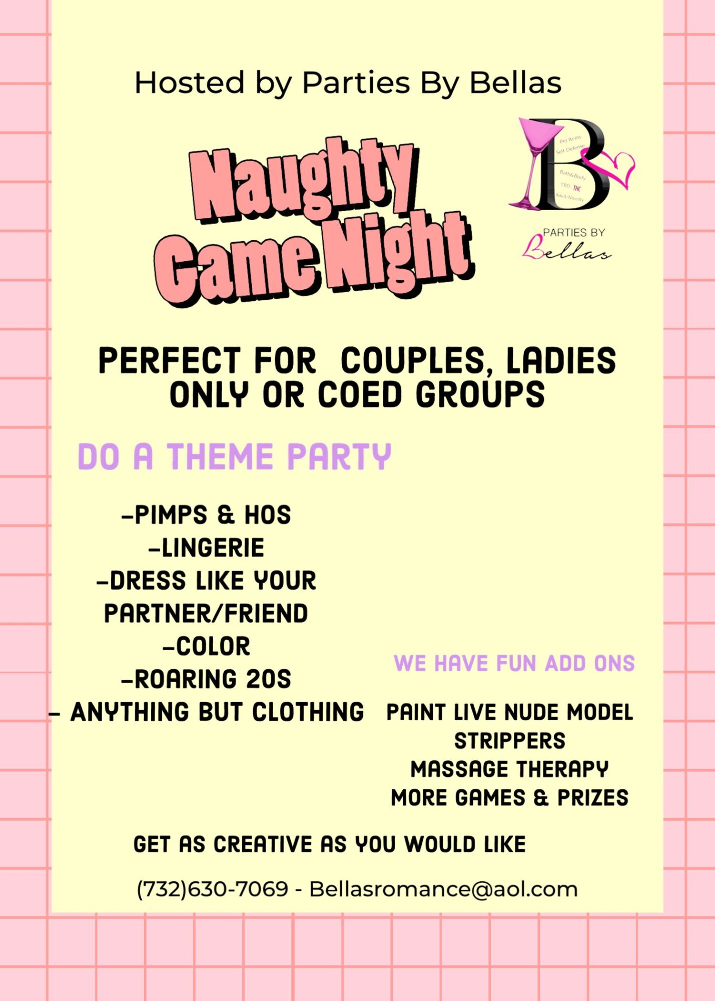 Parties by bellas is a in home adult lifestyle company. We Will come to your home with an array of products ranging from CBD, THC, bath & body products, Pet items, Self defense items, massage items & of course adult items. We will play games for prizes and while you and your friends are having fun we will educate you and create a safe space To talk about things that need to be talked about an you might not always feel safe to. We have also recently amplified these parties to a naughty game night option for Tons more prizes and games