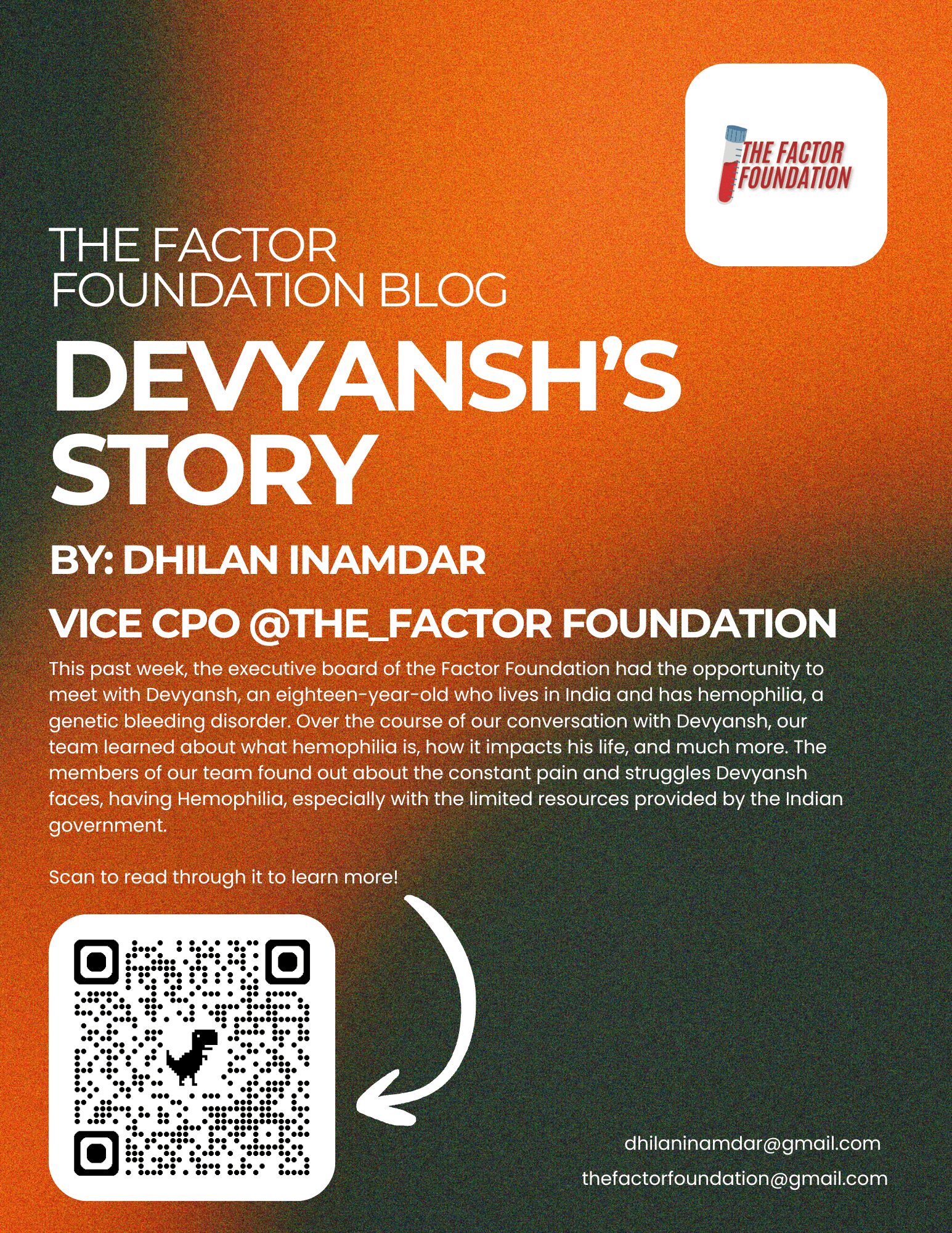 This realization crystallized my passion for hematology, but I knew I couldn’t wait for a medical degree to take action. At 14, I founded The Factor Foundation. What began as a promise to my cousin has evolved into a global 501(c)(3) nonprofit, proving that youth are a “factor” for change in healthcare today.